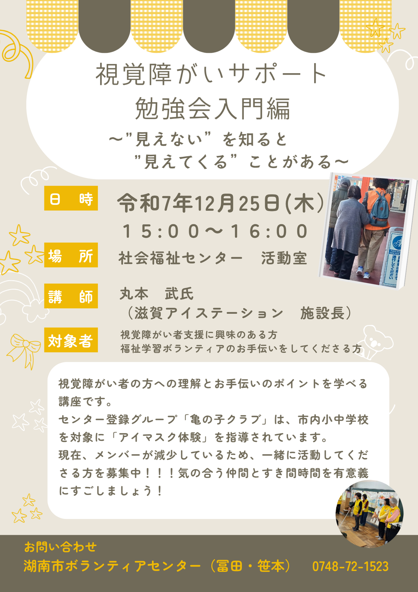 視覚障がい者の方への理解とお手伝いのポイントを学べる講座です。